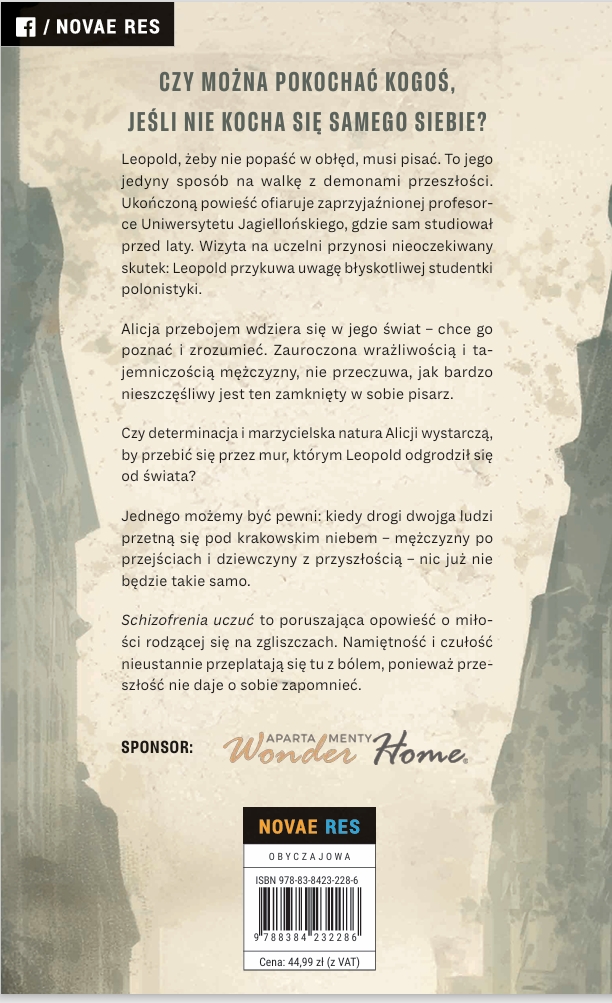 Kiedy się zejdą, pod niebem Krakowa, mężczyzna po przejściach, dziewczyna z przyszłością, nic już nie będzie takie samo. Bezpieczne światy runą jak domki z kart, a umysły i serca zatracą się w pełnym pasji tangu spalającym emocje, uczucia oraz namiętności. „Schizofrenia uczuć” to nie słodki romans w rodzaju: żyli długo i szczęśliwie. Tu mroczna strona ludzkiej natury zazdrośnie strzeże dostępu do samotności i sekretów osoby, którą włada. To historia o uczuciach trudnych do odczytania, niejednoznacznych, często sprzecznych, a nawet zwalczających się nawzajem. Bo czy można pokochać kogoś, skoro nie kocha się nawet siebie? Alicja, błyskotliwa studentka, która przebojem pojawia się w świecie Leopolda jest o tym przekonana: „Tylko umiera się jeden raz. Życie można zaczynać wiele razy od nowa. Chociaż zapewne ciężko uwierzyć w to komuś, kto akurat przemierza piekło”.