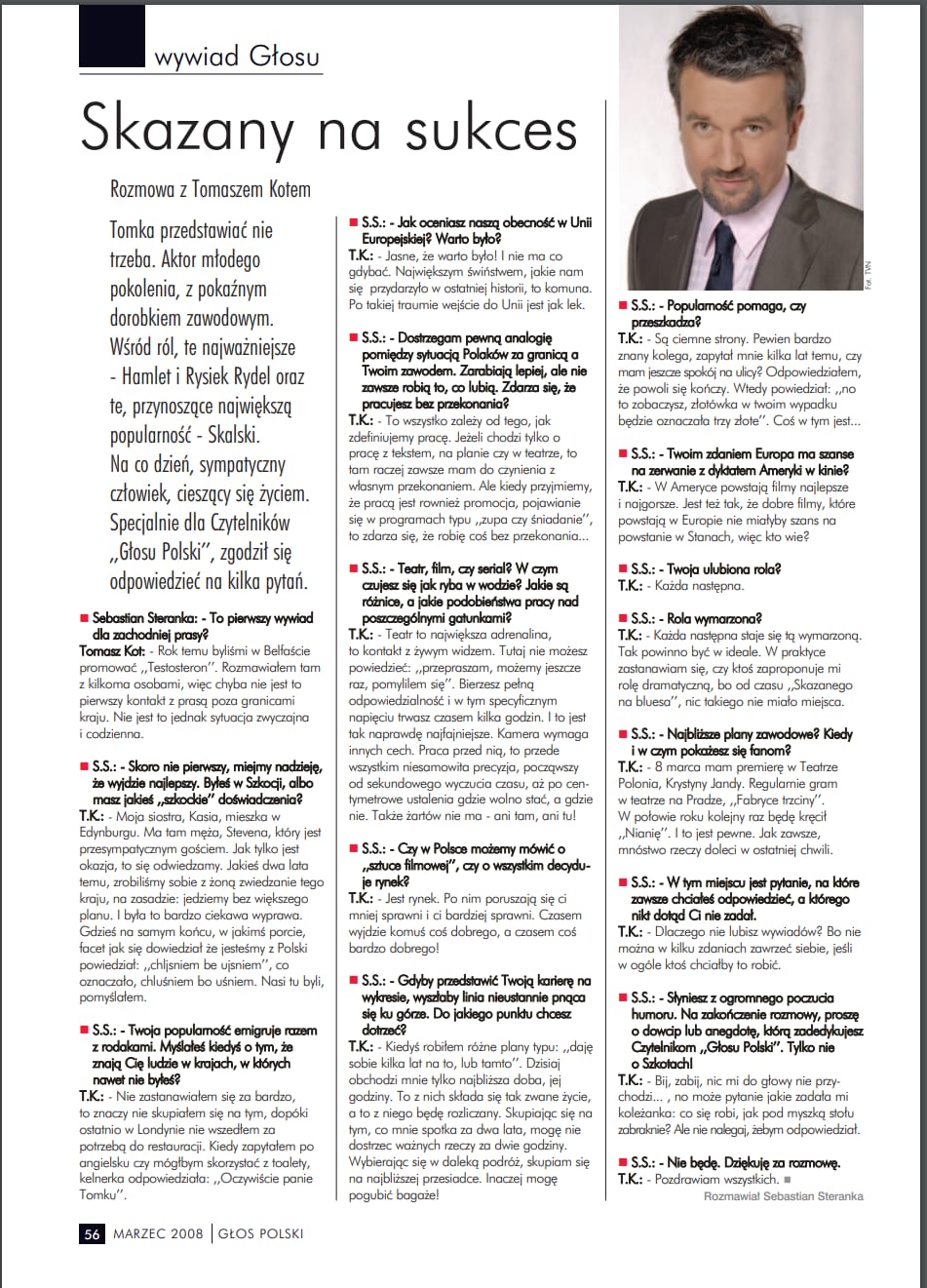 T.K. - To wszystko zależy od tego, jak zdefiniujemy pracę. Jeżeli chodzi tylko o pracę z tekstem, na planie, czy w teatrze, to tam raczej zawsze mam do czynienia z własnym przekonaniem. Ale kiedy przyjmiemy, że pracą jest rownież promocja, pojawianie się w programach typu „zupa czy śniadanie“, to zdarza się, że robię coś bez przekonania... .